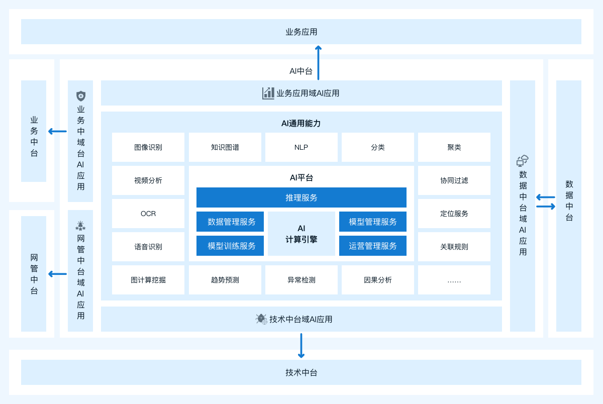 以九游会在线登录官网全域人工智能平台(AISWare AI²)产品为基础,通过流程贯通、数据共享,提供从数据接入、数据开发、AI模型开发、AI服务上线的一站式端到端的开发能力,为各中台及业务应用研发人员,提供安全、高效、敏捷的研发支撑,对内赋能运营支撑,对外赋能产业发展。对内:将AI应用于智能运维、智能营销、智能客服、智能经分、智能计费、智能5G网络建设等通信业务方面,以此不断改善用户体验,提升运营效率。对外:借助AI向智慧城市、智能园区、智慧金融、智能教育、智能政务、智能制造、数字家庭、物联网等新兴领域延伸,以此赋能、激活新生态。