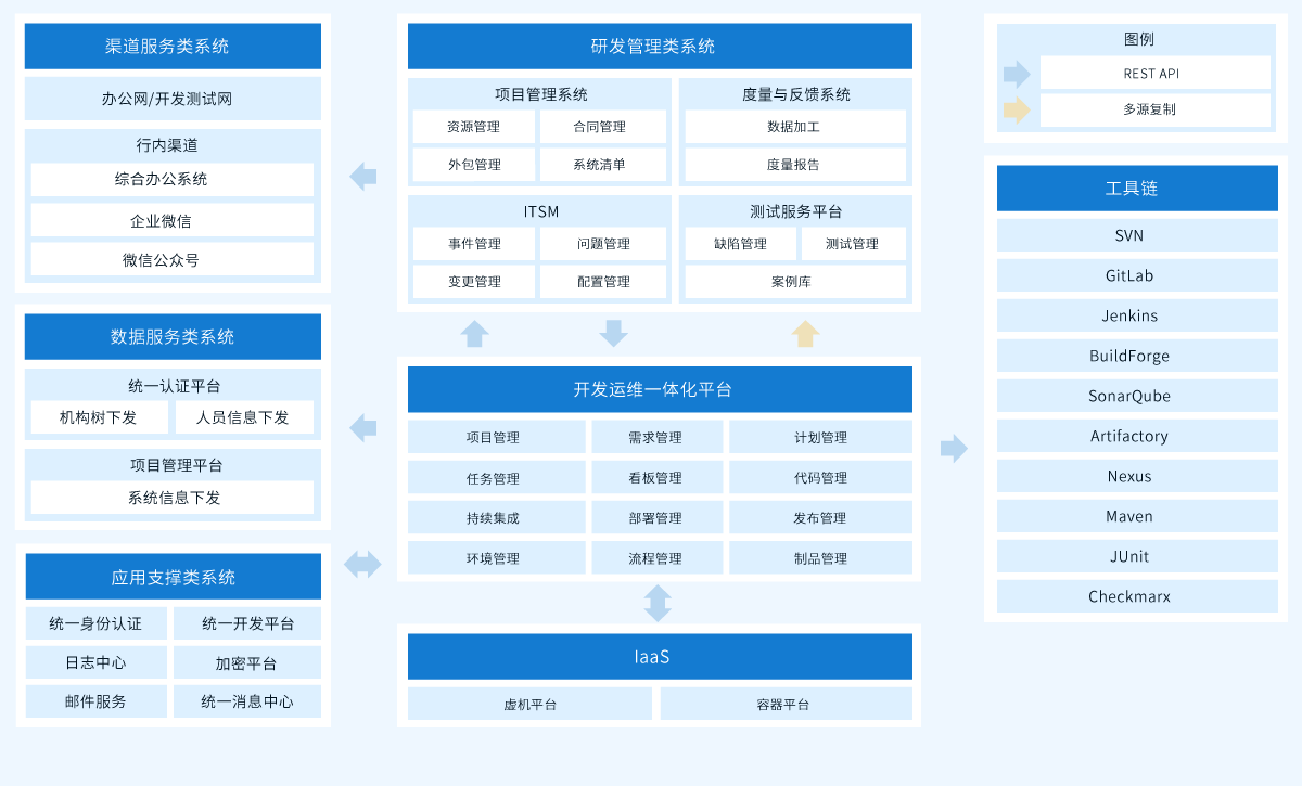 某银行在IT建设过程中,传统瀑布开发模式已完全无法适应市场需求的快速变化。冗长的开发审批流程,低效的应用发布模式,混乱的代码制品管理,割裂的开发和运维阶段,限制着该银行信息技术的快速发展。该行希望通过DevOps项目,打造全面线上化、自动化、规范化的开发运维体系,提升持续交付效率与质量,快速响应市场需求变化,从而提升在同业的竞争力,保持同业优秀水平。