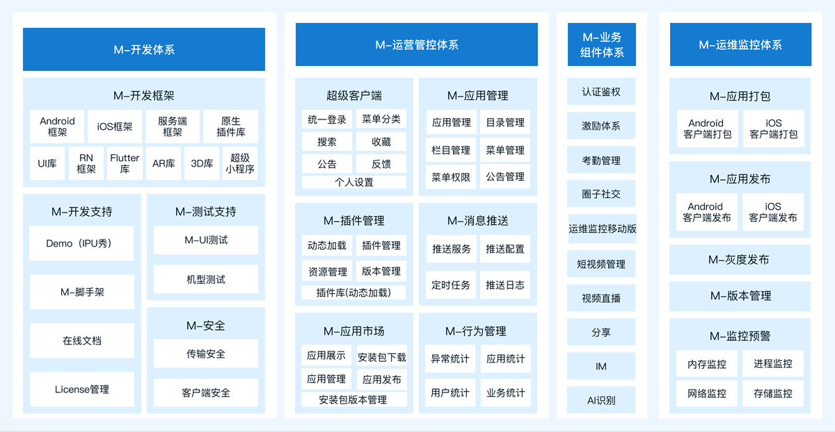 协助企业构建移动应用生态。 从各层面(开发、运营、管理、运维监控等)为构架企业级移动应用生态提供产品支撑。