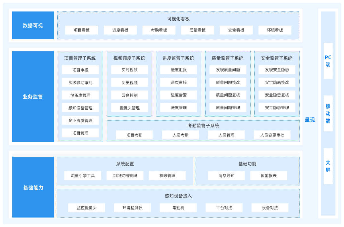 以视频调度为核心,提供“ 一套标准、 一个平台、 多个系统”,打造以重点工程为主体的多方协同、多级联动、管理预控、整合高效的智慧化监管服务平台,实现对辖区重点工程的施工进度、投资进度、质量安全等内容的监管,将“事后处理”转变为“事前预防”、“事中控制”,进一步落实参建各方主体责任和政府监管责任,加强辖区重点工程项目全周期监管工作,强化施工现场巡检能力,提高建筑施工标准化、信息化、 规范化水平。